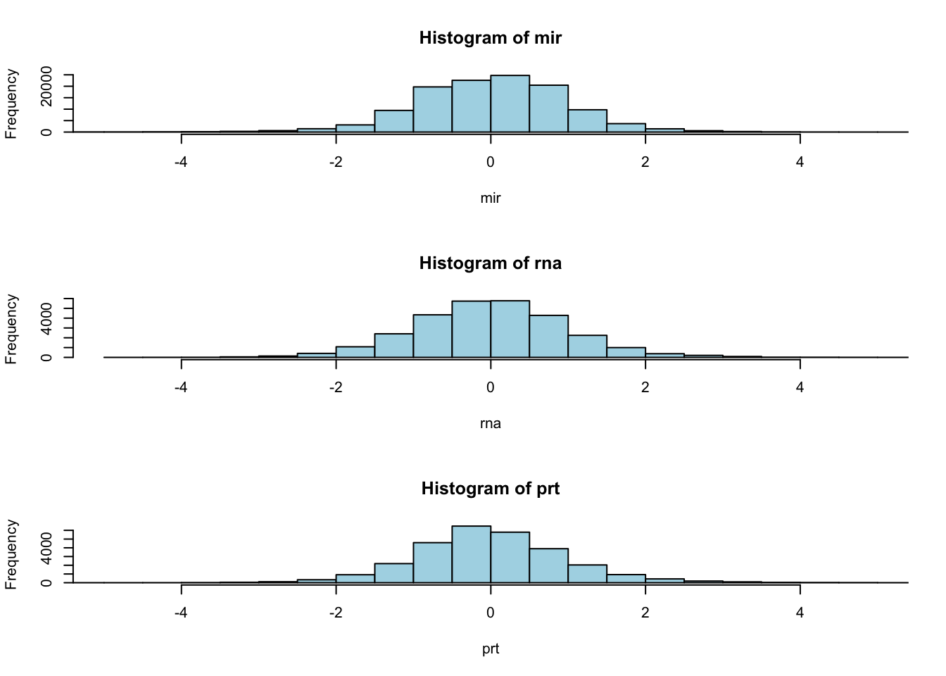 hist(rna, nclass=40, xlim=c(-5,5), col="lightblue")