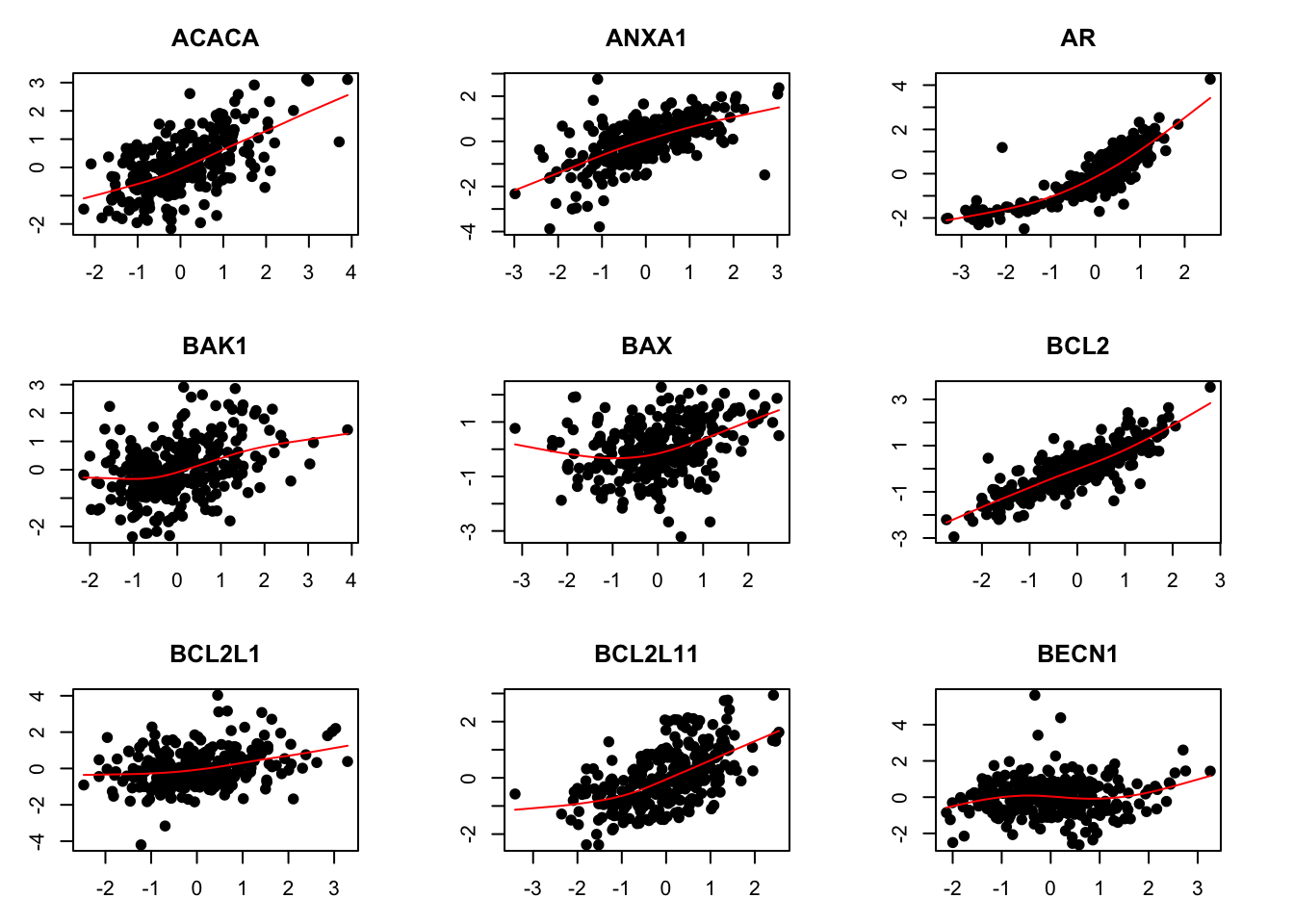 lines(smooth.spline(rna[i,], prt[i,], df=4), col="red")